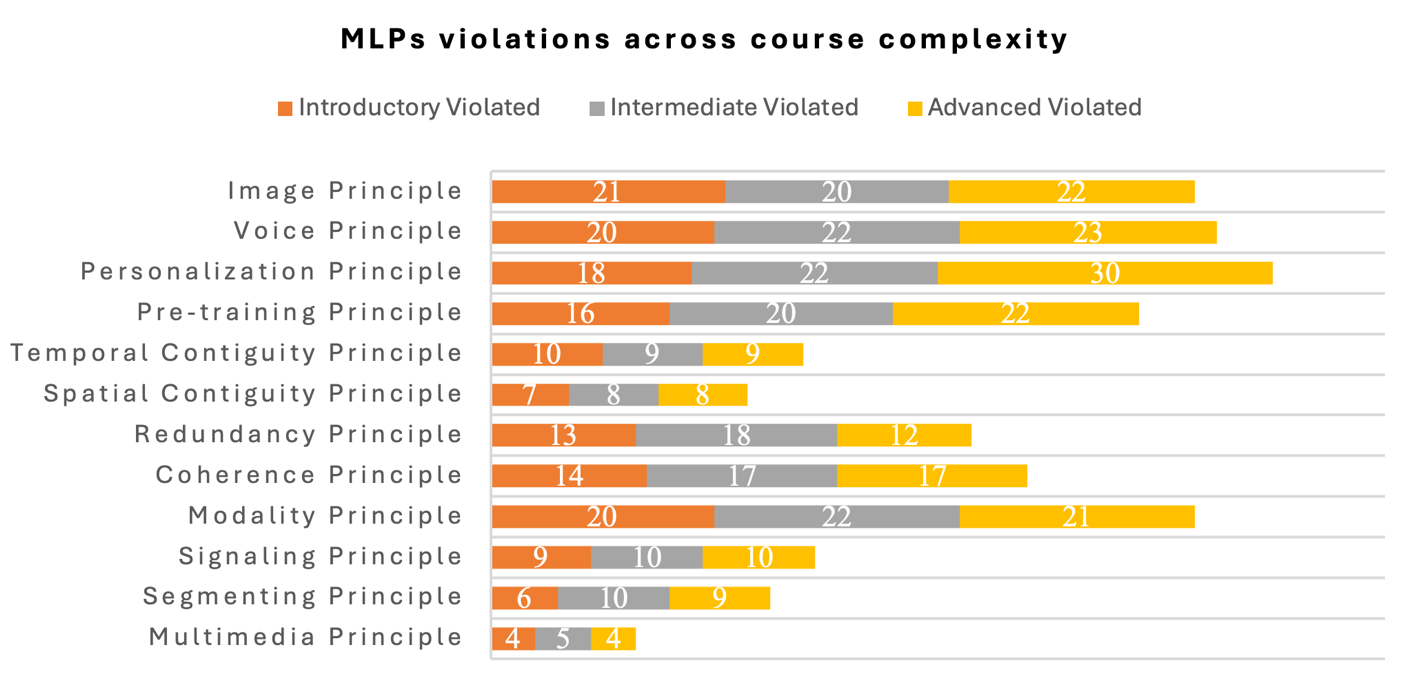 The integration of multimedia learning principles into institutional e-learning environments has become increasingly relevant in professional training contexts. However, limited attention has been given to how these principles are operationalized in law enforcement education. This study examines the application of established multimedia learning principles in the digital training modules of the Dubai Police Smart Training Center. A content analysis was conducted on thirty multimedia-enhanced courses, categorized by instructional level into introductory, intermediate, and advanced modules. The analysis focused on twelve principles derived from the Cognitive Theory of Multimedia Learning, assessing both adherence to and violations of these principles across course materials. Findings revealed inconsistent implementation of multimedia learning principles, with the Multimedia, Segmenting, and Spatial Contiguity principles observed more frequently than others. In contrast, Voice, Modality, Redundancy, Coherence, and Personalization were often applied in ways that diverged from recommended instructional design practices. No clear trends in adherence were associated with instructional level, indicating that design quality did not correspond to course complexity. These results suggest that multimedia elements are integrated without consistent reference to theoretical frameworks, highlighting the need for greater alignment between instructional design knowledge and digital content development. This study offers a foundation for continued examination of multimedia practices in specialized training contexts and recommends future research into the relationship between design implementation and learner experience, as well as the organizational factors that influence multimedia integration in professional education settings.