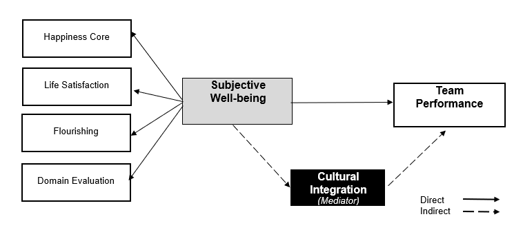 - Life satisfaction, flourishing, and domain evaluation significantly predict team performance. Cultural integration significantly mediates the well-being–performance relationship. Happiness core shows no direct effect.