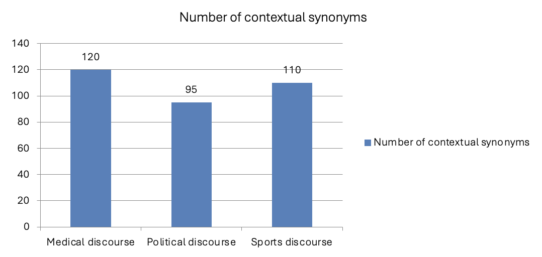 Contextual synonymy plays a significant role in contemporary media discourse by shaping semantic emphasis and emotional framing through figurative lexical choices. While previous research has examined metaphorical and evaluative language within individual domains, systematic cross-discursive comparisons remain limited. This study investigates the mechanisms underlying the creation and functioning of contextual synonyms in medical, political, and sports media texts and analyses their pragmatic role in structuring meaning within contemporary English media discourse. The analysis draws on qualitative content analysis supplemented by discourse-analytical interpretation and descriptive statistics. The corpus comprises 300 texts from five British newspapers (The Guardian, The Telegraph, Daily Mail, Mirror, and The Sun). A total of 325 instances of contextual synonyms were manually identified and coded: 120 in medical discourse, 95 in political discourse, and 110 in sports discourse. Contextual synonyms were operationalised as lexical items or multi-word expressions that substitute more neutral terms while introducing evaluative, metaphorical, or imagistic meaning. The units were classified into four functional-semantic categories: military vocabulary, zoomorphic images, strength/endurance images, and cognitive-psychological images. The findings demonstrate systematic cross-discursive variation. Medical discourse is dominated by military metaphors framing health issues as crises requiring mobilisation. Political discourse relies extensively on zoomorphic and cognitive-psychological imagery that stabilises moral evaluation and reinforces ideological polarisation. Sports discourse privileges strength and animal metaphors that contribute to heroisation and spectacle. The study concludes that contextual synonymy functions as a higher-order framing mechanism linking lexical choice, emotional valence, and discursive strategy. By proposing a unified functional-semantic model, the research offers a framework for analysing evaluative language across media domains and provides a basis for further cross-linguistic and cross-cultural investigation.
